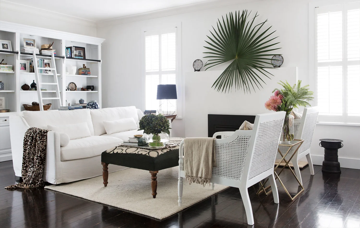 Olive branches cut from an established tree at the rear of the property splay out of a basket in the fireplace. Photography Nikole Ramsay.